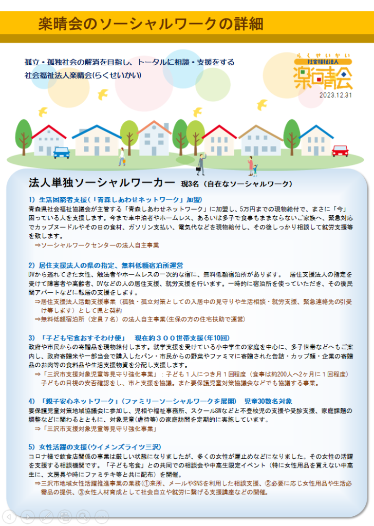 青森県社会福祉協議会が主管する「青森しあわせネットワーク」に加盟し、5万円までの現物給付で、まさに「今」困っている人を支援します。今まで車中泊者やホームレス、あるいは多子で食事もままならないご家族へ、緊急対応でカップヌードルやその日の食材、ガソリン支払い、電気代などを現物給付し、その後しっかり相談して就労支援等を致します。