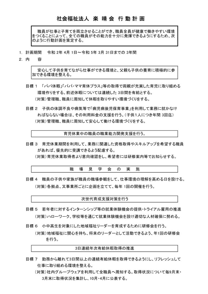 令和3年4月29日付 女性活躍推進法による「一般事業主行動計画」についてお知らせします。 当会では女性活躍推進法による一般事業主行動計画で、職員の皆様のリフレッシュを目的として「3日間以上連続有給休暇取得」を推進しております。 令和2年度下期が終了いたしましたので、下期の3日連続有給休暇取得状況につきましてご報告いたします。※3日連続有給休暇として、退職時の有給休暇消化・入院や体調不良・特別有休休暇については除いております。 令和2年度下期「3日以上連続有給休暇」の取得者は自己啓発・旅行等で24名・取得日数は94日という結果になりました。 上期と比較すると、人数では6名の増、日数では28日の増となり、日数・人数共に増加という結果となりました。新型コロナ禍で様々な規制があり、県を跨いでの移動も困難な時期ではありますが色々と工夫をし、仕事を離れてご家族と過ごす時間、読書、スポーツ、趣味等々の時間を設け新たな気持ちで働きやすい環境づくりに繋げていきましょう。 一般事業主行動計画令和2年4月1日~令和5年3月31日 一般事業主行動計画情報公表 社会福祉法人 楽晴会では一般事業主行動計画を更新いたしました。 更新するにあたり、女性活躍に関する情報公開として下記二点について公表いたします。【1】採用した労働者に占める女性労働者の割合 介護職員(正職員) 男性 40.5% 女性 59.5% 相談員‣ケアマネジャー 男性 25.0% 女性 75.0% 調理員 男性 33.3% 女性 66.7% 【2】男女の平均勤続年数の差異 正職員 男性 5年3ヶ月 女性 8年3ヶ月