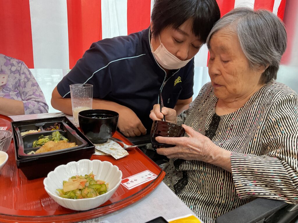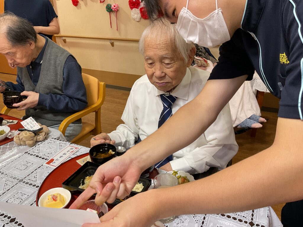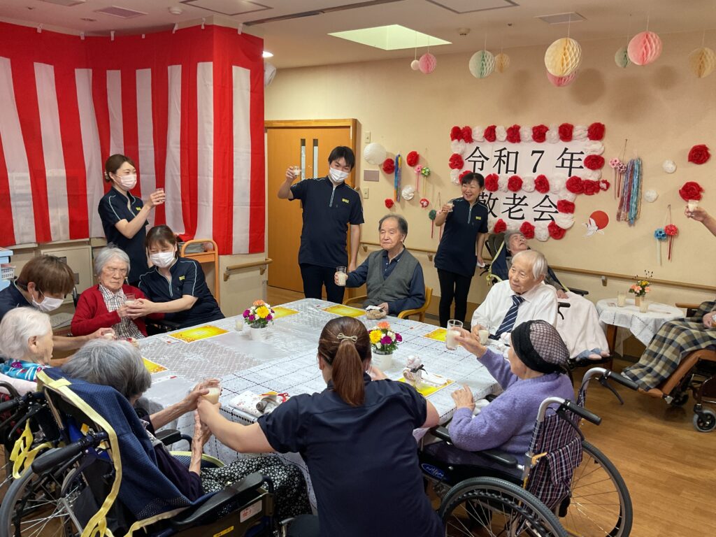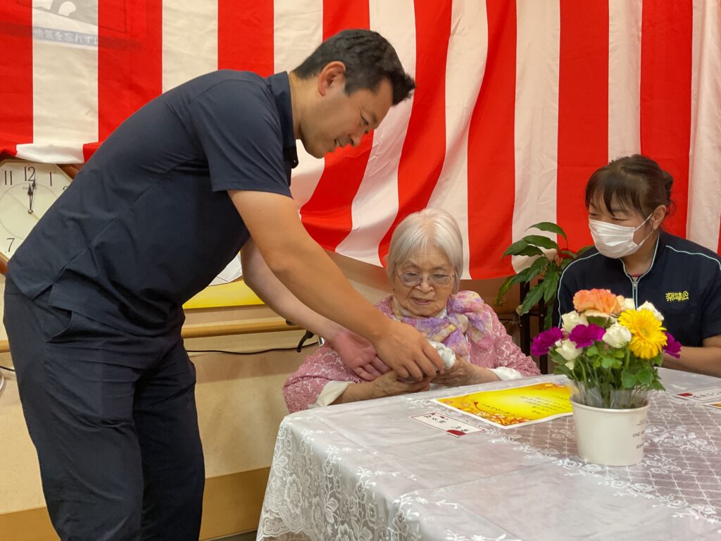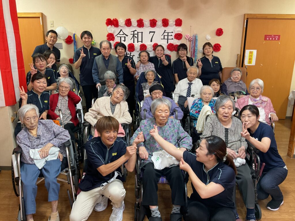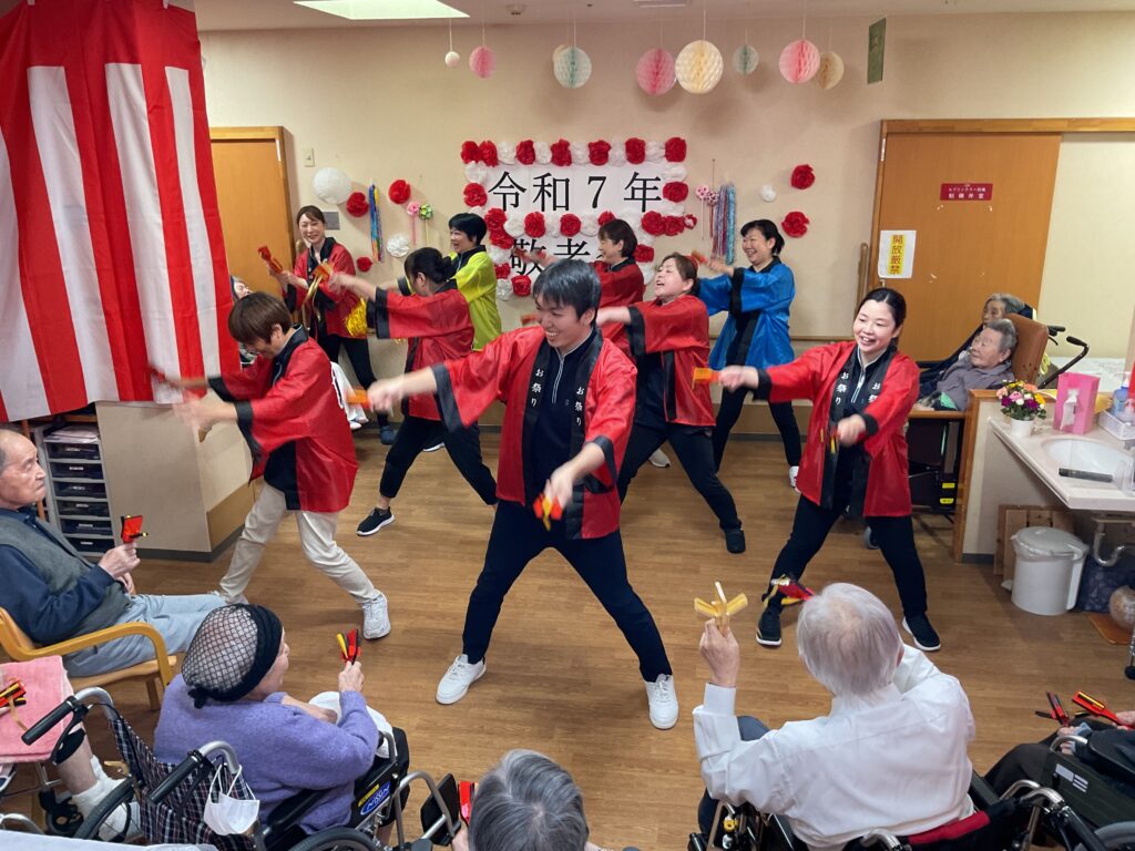 栄町コラボケアセンター 9月10日、11日二日間にわたり敬老会を行いました。お客様の中には卒寿、米寿、喜寿の方がおり表彰しお祝いしました。茶わん蒸し、栗ご飯など、いつもと違うお料理に喜ばれていました。余興では、お客様方の大好きな美空ひばりさんの歌を職員と一緒に大きな声で大合唱すると、感動し涙を流すお客様もおられました。 9/11は敬老会を行いました。ゆっくりと食事を楽しまれ「美味しかった」と喜んで頂けました。甘酒が美味しいとおかわりされる方もいらっしゃりました。食後にはお客様皆様と記念撮影を行いました。最後は職員の余興で「よさこいソーラン」をお客様と一緒に踊り楽しんでいただきました。
